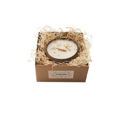Kokosová miska, 100% sójový vosk , dřevěný knot, 100% esenciální a vonné oleje, ruční zdobení sušenými květy a bylinkami.