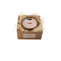 Kokosová miska, 100% sójový vosk , dřevěný knot, 100% esenciální a vonné oleje, ruční zdobení sušenými květy a bylinkami.