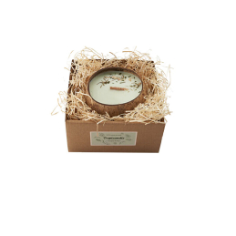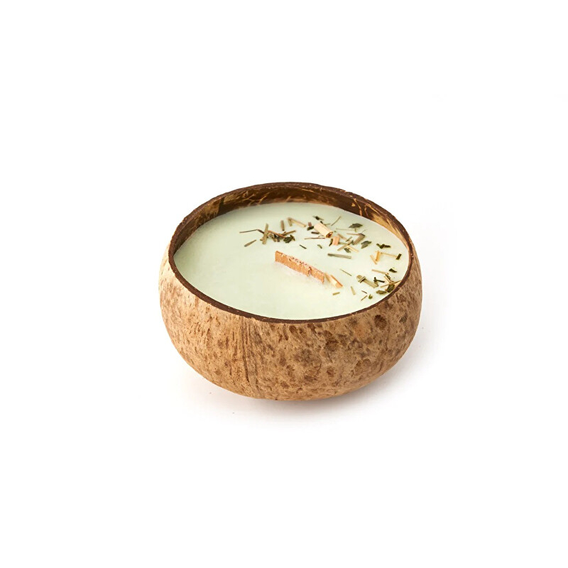 Kokosová miska, 100% sójový vosk , dřevěný knot, 100% esenciální a vonné oleje, ruční zdobení sušenými květy a bylinkami.