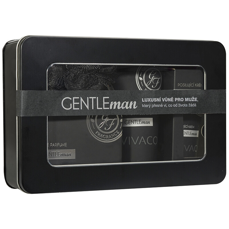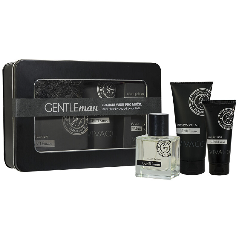 Parfém Gentleman 50 ml Posilující krém Gentleman 100 ml Sprchový gel 2v1 Gentleman 200 ml Masážní žínka 1 ks Plechový box 1 ks