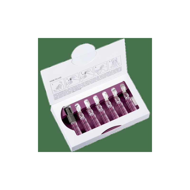 Ampulku protřepejte a hrdlo ampule zakryjte papírovým kapesníčkem nebo přiloženým otvírákem na ampule. Uchopte ampulku za hrdlo nebo otvírák a rozlomte ji na spodním barevném kroužku tahem dozadu. Nalijte koncentrát do dlaně a poté naneste na obličej, krk a dekolt. Jemně vklepejte do pokožky.