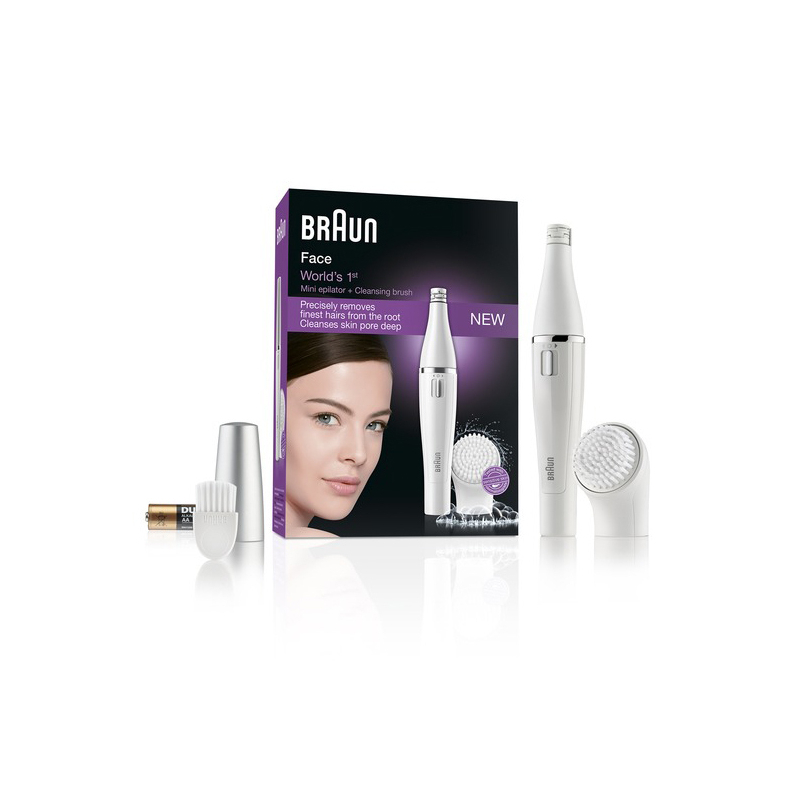 Obličejový epilátor, čisticí kartáček na obličej, ochranný kryt, 1× AA baterie.