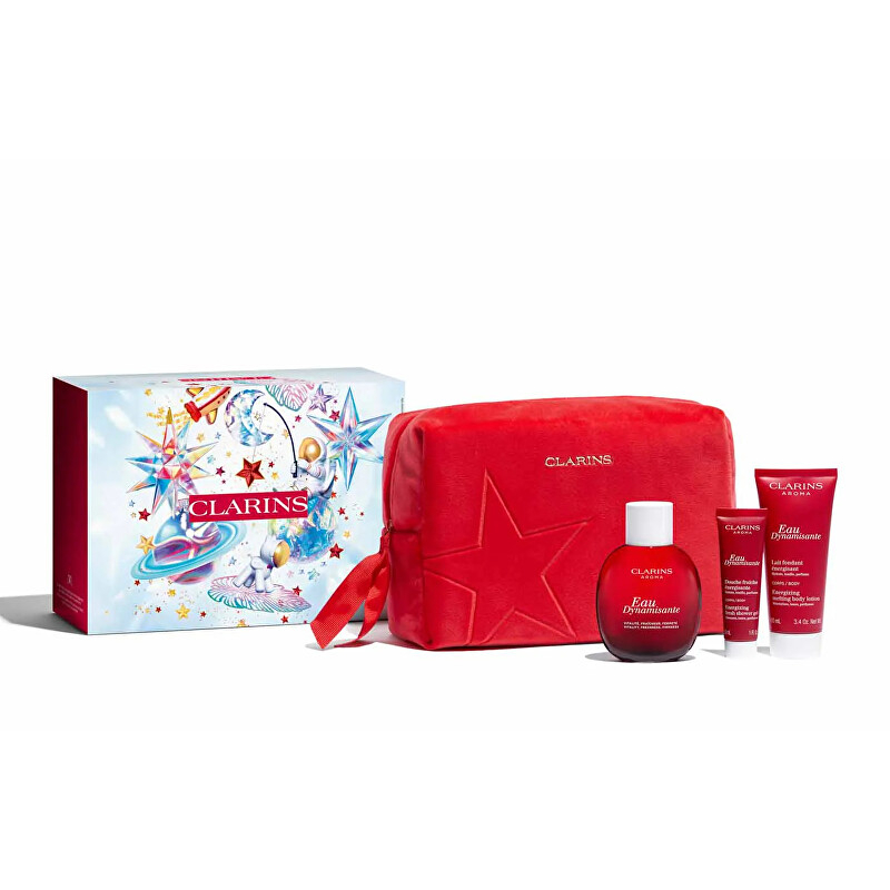 Dárková sada Eau Dynamisante od značky Clarins přináší harmonii mezi péčí o tělo a aromaterapií. Obsahuje tělový sprej, energizující mléko a sprchový gel, které společně revitalizují a osvěžují pokožku. Tělový sprej s léčivými esenciálními oleji, jako jsou citrusy a pačuli, dodává okamžitý pocit povzbuzení a jemně provoní pokožku. Energizující mléko zajišťuje intenzivní hydrataci a zanechává pleť sametově hebkou. Sprchový gel šetrně čistí a hydratuje, zatímco aloe vera a glycerin pečují o pokožku. Všechny produkty jsou baleny v elegantní kosmetické tašce, ideální jako dárek pro každou ženu.