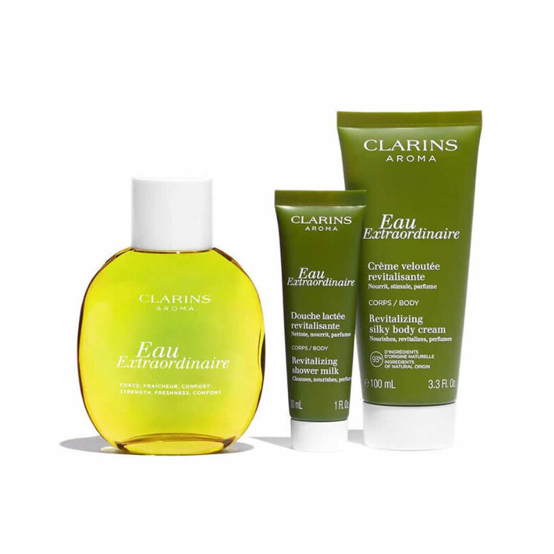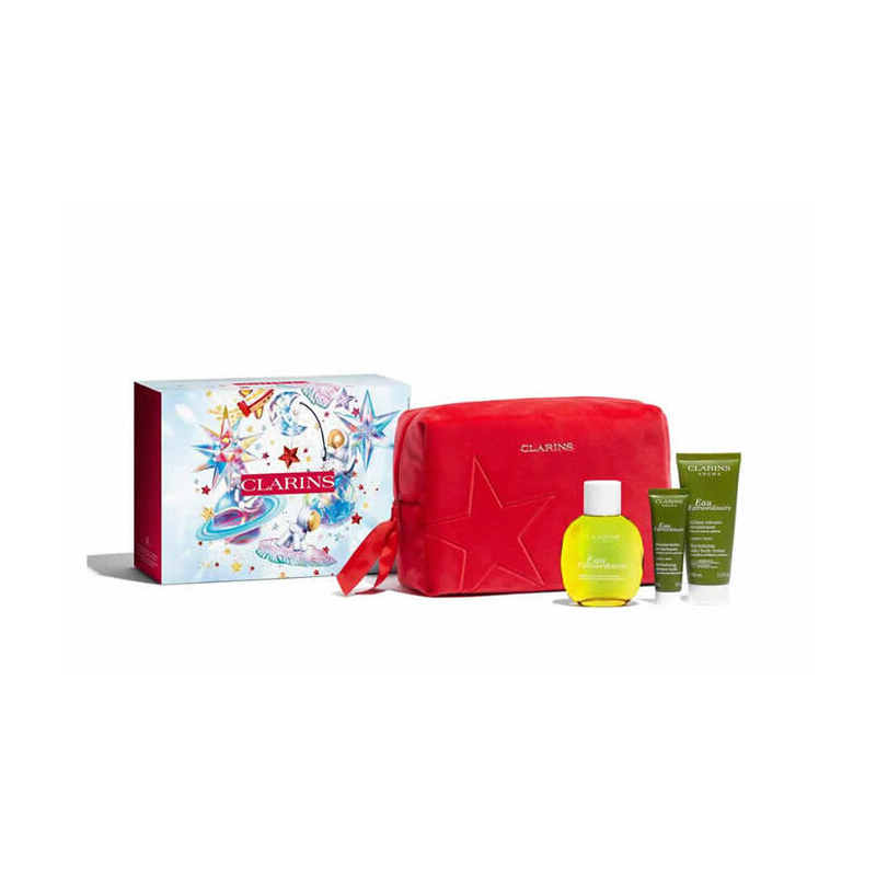 Dárková sada Eau Extraordinaire od značky Clarins přináší harmonii a osvěžení pro vaši pokožku. Obsahuje pečující vůni, revitalizační tělový krém a sprchové mléko, které společně vytvářejí dokonalý rituál péče. Vůně s výtažky z aceroly a BIO kolopejky zjemňuje pleť a dodává jí přirozený lesk. Tělový krém s BIO bambuckým máslem a olejem z lískových oříšků intenzivně vyživuje, zatímco sprchové mléko jemně čistí a hydratuje. Složení s 93 % přírodních ingrediencí zajišťuje bezpečnost a šetrnost. Dopřejte si každodenní luxus a objevte krásu vaší pokožky s touto jedinečnou sadou.