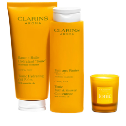Dárková sada Self-Care Essentials od značky Clarins je ideálním společníkem pro každodenní péči o tělo. Obsahuje hydratační tělový balzám, tonizační koupel a vonnou svíčku, které společně přinášejí pocit pohody a relaxace. Tělový balzám s 95 % přírodních složek vyživuje a zjemňuje pokožku díky rostlinným výtažkům a esenciálním olejům. Tonizační koupel jemně čistí a osvěžuje, zatímco vonná svíčka s citrusovými tóny vytváří příjemnou atmosféru. Sada je skvělým dárkem pro každou ženu, která ocení kvalitní přírodní kosmetiku a péči o sebe. Dopřejte si chvíle klidu a harmonie.