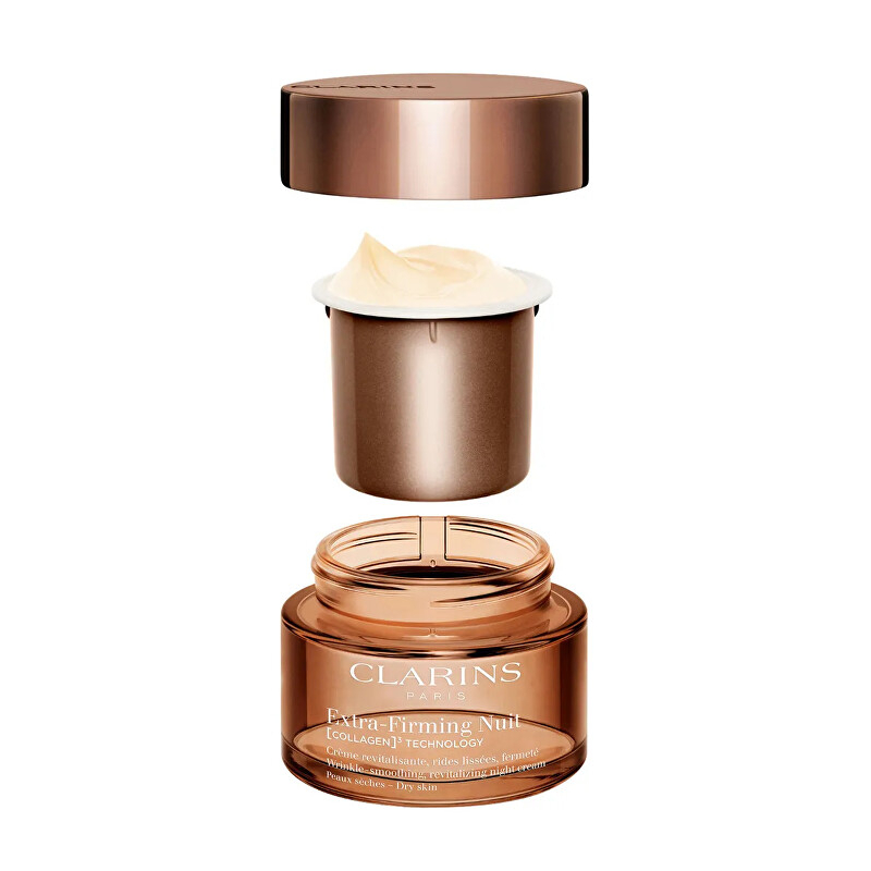 Náhradní náplň do nočního zpevňujícího krému Extra-Firming Nuit Collagen Technology je ideálním řešením pro suchou pleť, která potřebuje intenzivní regeneraci. Díky inovativní technologii [COLLAGEN]³, obsahující kolagenový polypeptid, extrakt z pekanového ořechu a Mitracarpus, podporuje tvorbu kolagenu a zpevňuje pleť. Niacinamid navíc zlepšuje texturu pleti a dodává jí zdravý jas. Po aplikaci večer se pleť během noci regeneruje, a ráno je odpočatá, vyhlazená a připravená na nový den. Ekologické balení umožňuje opětovné doplnění, čímž přispívá k ochraně životního prostředí.