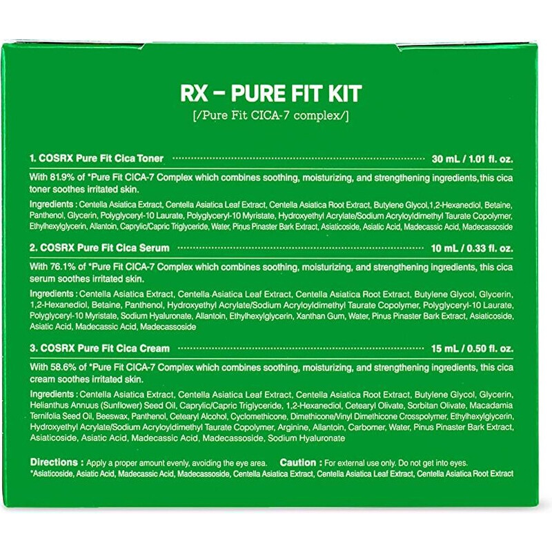 Dárková sada péče o pleť Pure Fit Cica-7 Kit je ideálním řešením pro citlivou a problematickou pokožku. Obsahuje pleťové tonikum, zklidňující sérum a pleťový krém, které společně vytvářejí harmonickou péči. Tonikum s komplexem Cica-7 hydratuje a zklidňuje pleť, zatímco sérum s 76 % extraktem z pupečníku asijského posiluje kožní bariéru a dodává ochranu. Lehce vstřebatelný krém pak intenzivně hydratuje a chrání pleť bez pocitu mastnoty. Tato sada je vhodná pro všechny typy pleti a pomáhá udržovat zdravý vzhled pleti. Objevte sílu přírody s produkty COSRX.