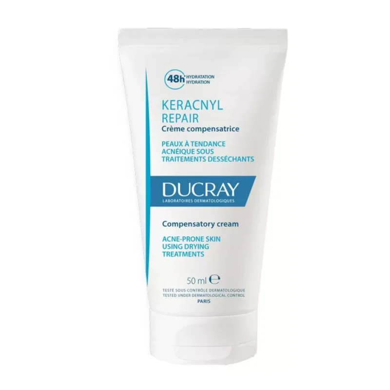 Hydratační krém Keracnyl Repair je ideálním řešením pro pleť oslabenou dermatologickou léčbou akné. Tento zklidňující krém okamžitě zmírňuje podráždění, zarudnutí a pocit pnutí, což oceníte již po první aplikaci. Díky inovativní hydra-kompenzační technologii poskytuje intenzivní hydrataci až na 48 hodin, čímž podporuje obnovu kožní bariéry. Obsah niacinamidu zajišťuje zklidnění pleti, prevenci vysušení a posílení její struktury. Vhodný pro mladistvou i dospělou pleť, tento krém efektivně zmírňuje olupování a suchost, čímž přispívá k celkovému zlepšení vzhledu pleti. Aplikujte ráno a večer na čistou pleť pro optimální výsledky.