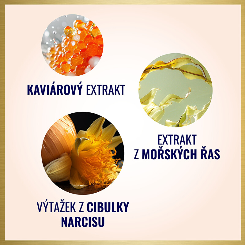 Oční krém Gold Elixir s výtažkem z kaviáru je ideálním řešením pro péči o jemnou pleť kolem očí. Tento luxusní produkt obnovuje a regeneruje buněčnou strukturu pleti, čímž zpomaluje proces stárnutí. Obsahuje extrakt z cibulky narcisu, který účinně vyrovnává hluboké vrásky a zpevňuje pleť, zatímco omega 3 a 6 mastné kyseliny poskytují intenzivní výživu a hydrataci. Pravidelným používáním se zlepší textura pleti a jemné linky budou méně viditelné. Aplikujte ráno a večer pro maximální účinek a užijte si mladistvý vzhled svých očí.