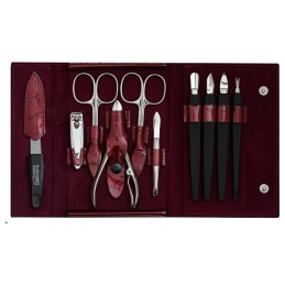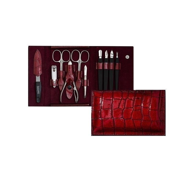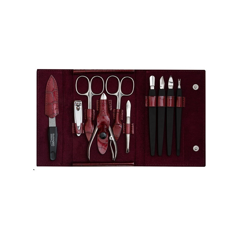 Manikúrová sada z pravé červené kůže a lesklého niklu přináší dokonalou kombinaci elegance a funkčnosti. Vyráběná v německém Solingenu, známém pro svou tradici v kvalitní oceli, zaručuje dlouhou životnost a precizní zpracování. Sada obsahuje nůžky na nehty, nůžky na kůži, safírový pilník, šikmou pinzetu a kleštičky, což z ní činí ideální volbu pro každodenní péči o nehty. Patentové zapínání a design ve tvaru peněženky dodávají sadě na praktičnosti a stylu. Využijte tuto sadu pro profesionální úpravu nehtů a užijte si péči, která spojuje kvalitu s elegancí.