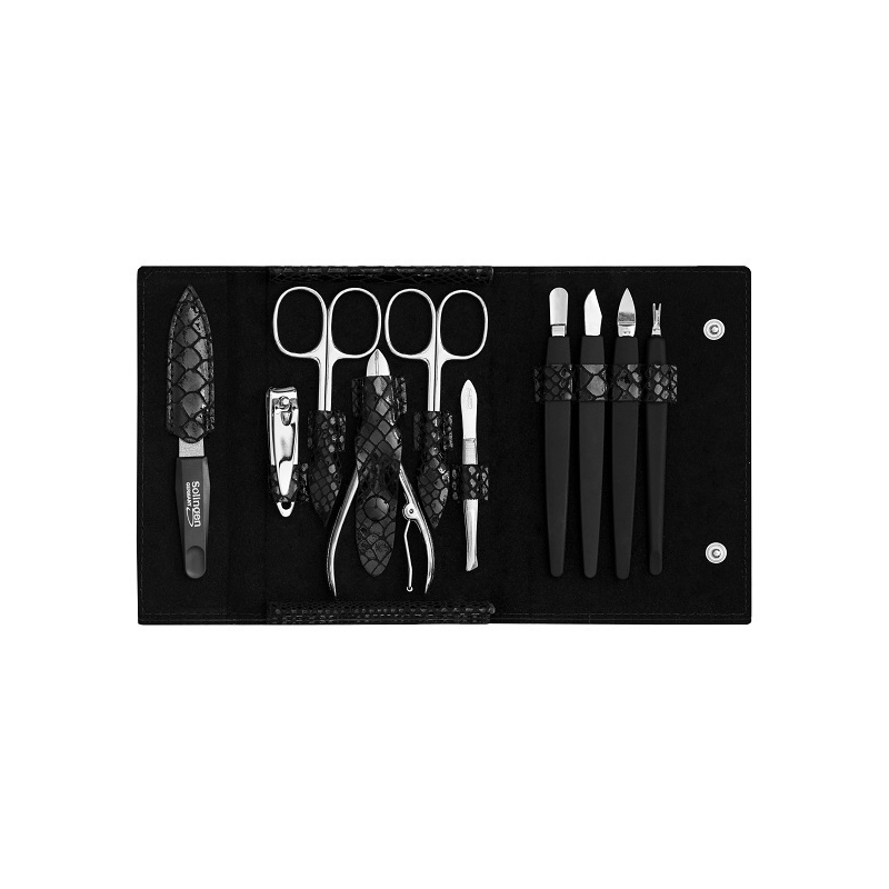 Rodinná manikúrová sada 10 dílná PL 252CNH představuje ideální volbu pro všechny, kdo si chtějí dopřát profesionální péči o nehty v pohodlí domova. Elegantní pouzdro z pravé kůže s hadím motivem dodává této sadě na stylu a praktičnosti. Obsahuje nůžky na nehty, nůžky na kůži, kleštičky a další nezbytné nástroje pro dokonalou úpravu nehtů. Všechny výrobky jsou vyrobeny v Německu, což zaručuje jejich vysokou kvalitu a dlouhou životnost. S touto sadou si snadno poradíte s úpravou nehtů a kůžičky, ať už doma nebo na cestách. Dopřejte si péči, kterou si zasloužíte.