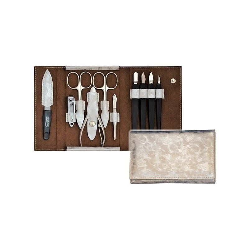 Rodinná manikúrová sada DuKaS v elegantním stříbrno béžovém pouzdře z pravého semiše je ideálním pomocníkem pro dokonalou péči o nehty. Tato 10dílná sada obsahuje vše potřebné pro úpravu nehtů a kůžičky, včetně nůžek na nehty, nůžek na kůžičku a kleštiček různých velikostí. Safírový pilníček zajišťuje jemné a efektivní tvarování, zatímco šikmá pinzeta a vidlička na nehtovou kůžičku usnadňují precizní úpravy. Díky kompaktnímu designu je sada ideální na cesty i pro domácí použití. Udržujte své nehty v perfektním stavu s touto profesionální sadou, která splní očekávání každého člena rodiny.