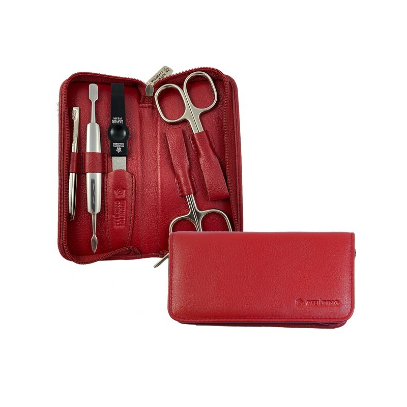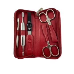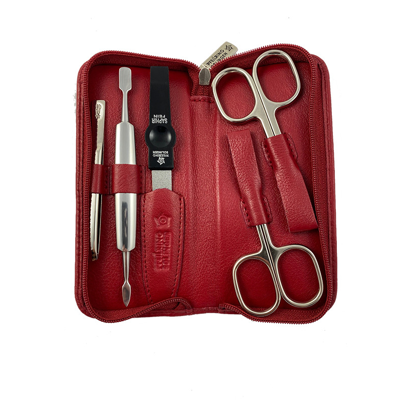 Manikúrová sada Pfeilring Original v elegantní červené barvě je ideálním pomocníkem pro dokonalou péči o nehty. Obsahuje pět precizně zpracovaných nástrojů, které usnadňují úpravu nehtů a kůžičky. Nůžky na nehty a kůžičku zaručují přesnost a pohodlí, zatímco šikmá pinzeta a oboustranný manikúrový nástroj umožňují precizní detaily. Safírový pílníček na nehty zajišťuje hladký a zdravý vzhled nehtů. Tato sada je nejen praktická, ale také stylová, což z ní činí skvělý doplněk každé kosmetické taštičky. Využijte kvalitní nástroje pro profesionální úpravu nehtů přímo doma.