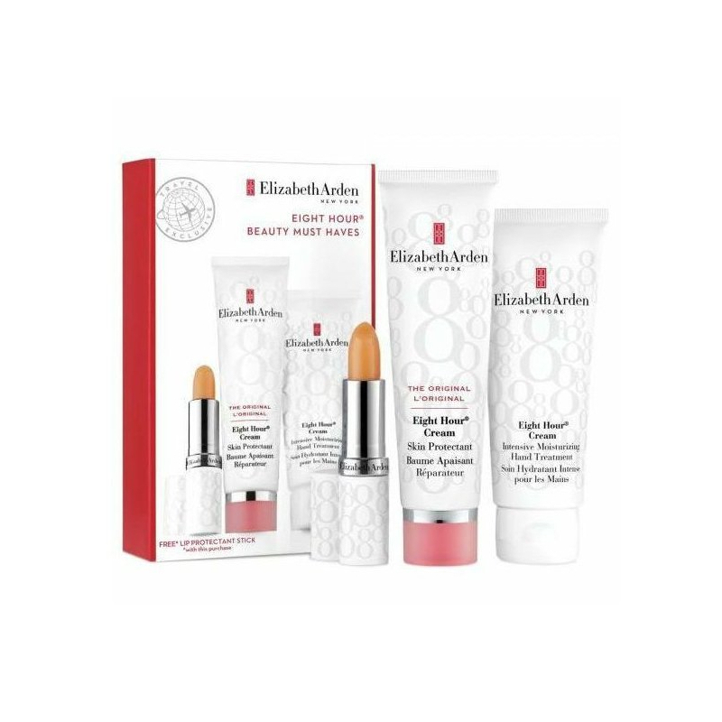 Dárková sada ochranné a hydratační péče Eight Hour od Elizabeth Arden je ideálním společníkem pro každodenní péči o pleť a ruce. Obsahuje ikonický ochranný krém, který poskytuje až osmihodinovou ochranu a intenzivní hydrataci. Díky aktivním látkám, jako je petrolatum a vitamin E, chrání pleť před nepříznivými vlivy a zamezuje ztrátě vlhkosti. Hydratační krém na ruce se rychle vstřebává a zanechává pokožku jemnou a vyživenou, zatímco balzám na rty dodává potřebnou ochranu a hebkost. Tato sada je perfektní volbou pro každého, kdo hledá kvalitní péči o pleť a ruce.