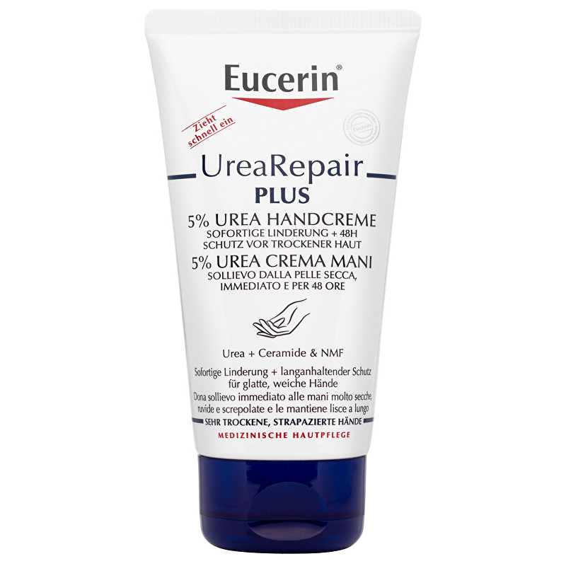 Krém na ruce 5% UreaRepair PLUS od značky Eucerin je ideálním řešením pro velmi suché a hrubé ruce. Obsahuje ceramidy a přirozené hydratační látky, které posilují lipidové bariéry pokožky a zajišťují dlouhotrvající hydrataci. Tento krém se rychle vstřebává a jeho nemastná textura je vhodná pro každodenní použití, včetně péče o pokožku se sklonem ke xeróze, lupénce či pro diabetiky. Bez parfemace a barviv, je šetrný i k citlivější pleti. Aplikujte na čistou pokožku rukou dle potřeby a dopřejte svým rukám péči, kterou si zaslouží.