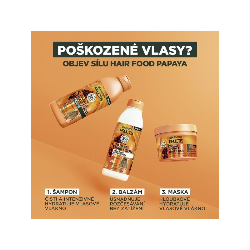 Regenerační kondicionér Fructis Hair Food s papájou je ideálním řešením pro poškozené vlasy, které potřebují intenzivní péči. Díky svému jemnému složení s 98 % přírodních ingrediencí proniká hluboko do struktury vlasů, čímž zajišťuje výživu a hydrataci. Tento veganský kondicionér zlepšuje rozčesávání, dodává vlasům zdravý lesk a obnovuje jejich přirozenou sílu. Po aplikaci se vlasy stávají hebkými a snadno ovladatelnými. Pro dosažení nejlepších výsledků naneste na umyté vlasy, nechte chvíli působit a důkladně opláchněte. Dopřejte svým vlasům péči, kterou si zaslouží.