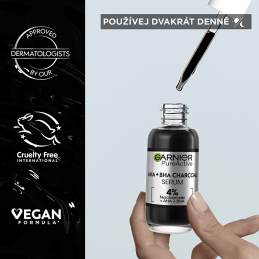 Sérum proti nedokonalostem pleti AHA + BHA Charcoal je ideálním řešením pro problematickou pleť. Díky 4 % obsahu aktivních látek, jako jsou niacinamid, AHA a BHA, účinně redukuje pupínky a skvrny, čímž zanechává pleť hladší a sjednocenější. AHA přispívá k exfoliaci, zatímco BHA pomáhá vyčistit póry a eliminovat nedokonalosti. Niacinamid je známý svými protizánětlivými účinky, které podpoří zdravý vzhled pleti. Aktivní uhlí navíc zmatňuje pleť a dodává jí svěží vzhled. Pro dosažení nejlepších výsledků aplikujte sérum na vyčištěnou pleť a jemně vmasírujte.