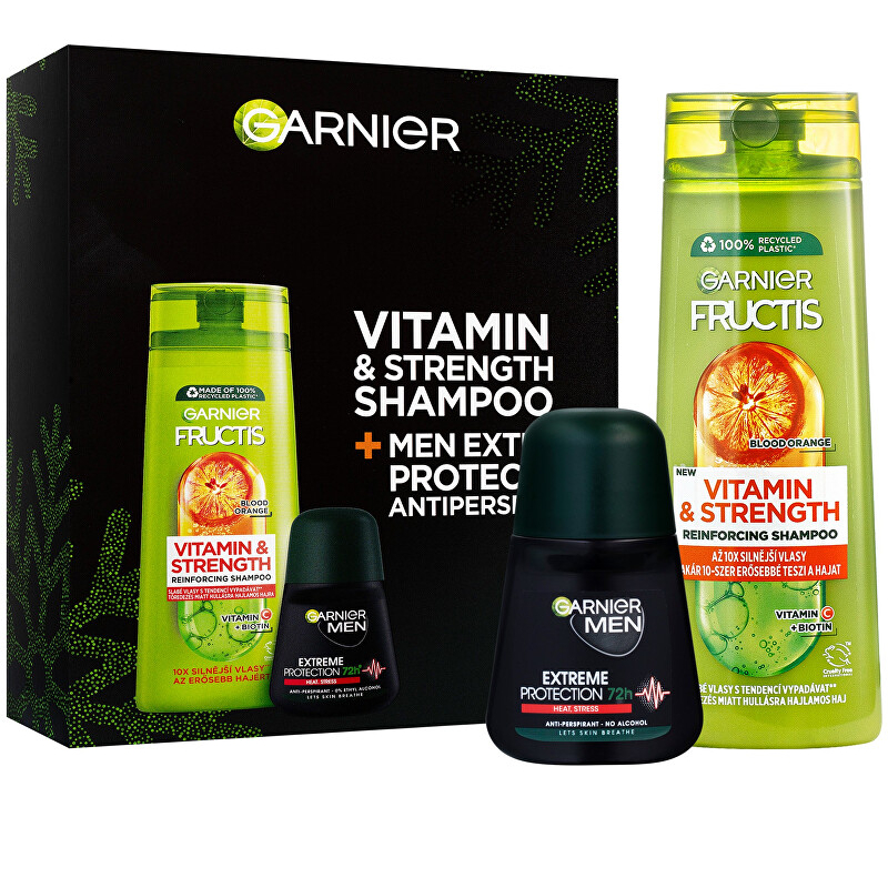 Dárková sada tělové a vlasové péče pro muže přináší efektivní řešení pro posílení a ochranu. Obsahuje posilující šampon Fructis Vitamin & Strength, který díky výtažkům z červeného pomeranče a multivitaminovému komplexu revitalizuje vlasy od kořínků po konečky. Tento šampon je ideální pro jemné a vypadávající vlasy, dodává jim vitalitu a sílu. K tomu se přidává roll-on antiperspirant 72H Extreme Protection, který zajišťuje dlouhotrvající ochranu proti pocení a zápachu. Obsah minerální látky Mineralite efektivně absorbuje vlhkost a udržuje pokožku suchou. Oba produkty jsou navrženy tak, aby splnily potřeby moderního muže.