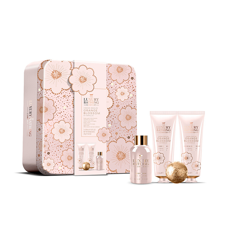 Dárková sada péče o tělo v plechové dóze Creme brulée, Pomerančový květ přináší harmonii a relaxaci do každodenní péče. Obsahuje sprchový gel, krém na ruce, tělový krém a šumivou kouli do koupele, které jsou obohaceny o přírodní složky. Sprchový gel jemně čistí a zanechává pokožku hebkou, zatímco krém na ruce s glycerinem poskytuje intenzivní hydrataci a ochranu. Tělový krém dodává potřebnou vlhkost a příjemnou vůni. Šumivá koule do koupele promění koupel na relaxační zážitek. Vůně sladké vanilky a pomerančového květu navodí pocit pohody. Vegan a cruelty-free.