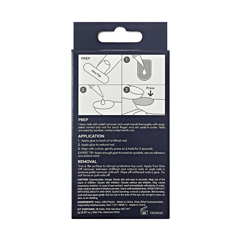 28 umělých nehtů, růžové gelové lepidlo, tyčinka na kůžičku, mini pilník na nehty.