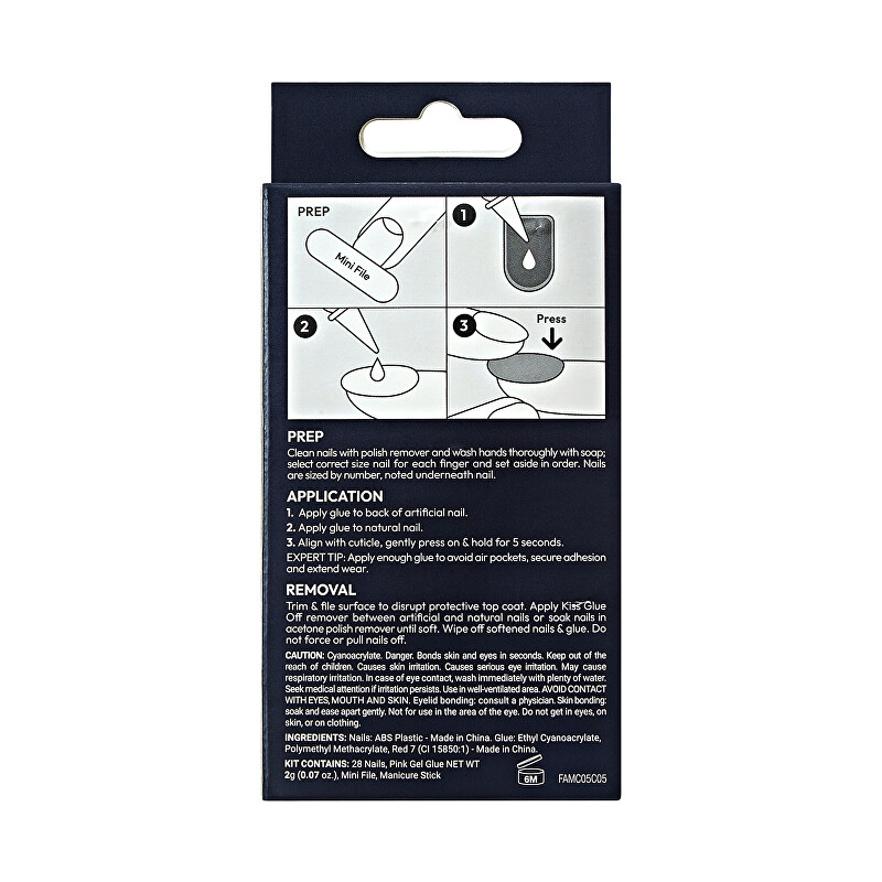 28 umělých nehtů, růžové gelové lepidlo na nehty, tyčinka na kůžičku, mini pilník na nehty.