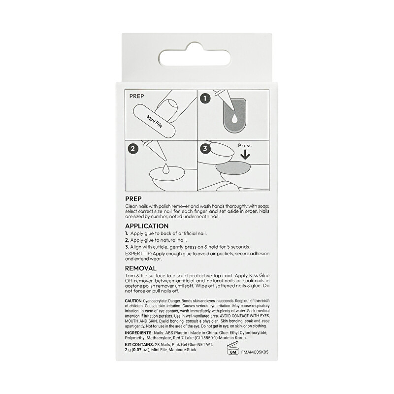 28 umělých nehtů, růžové gelové lepidlo, tyčinka na manikúru, mini pilník na nehty.