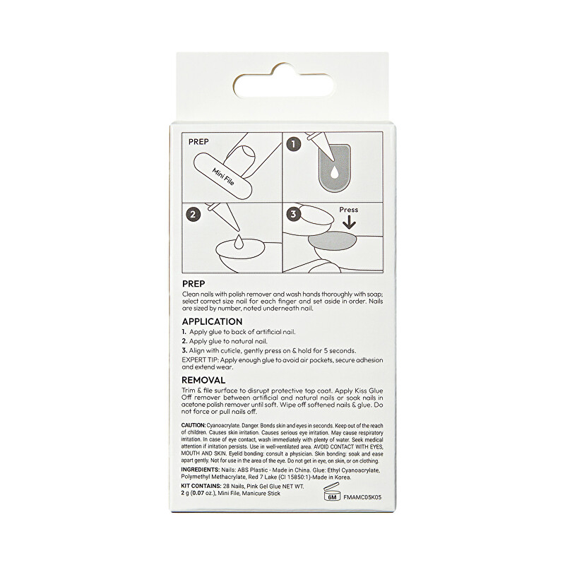 28 umělých nehtů, růžové gelové lepidlo, tyčinka na manikúru, mini pilník na nehty.