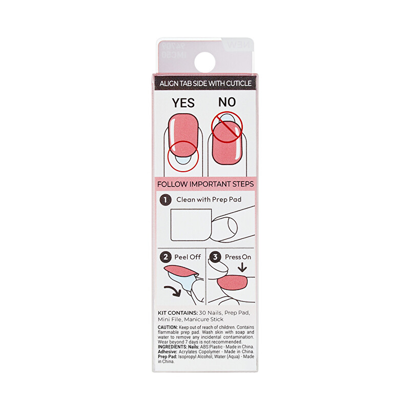 Zpracování a balení samolepících nehtů imPRESS Color Nails probíhá v pečlivě kontrolovaném prostředí, které zajišťuje maximální čistotu a hygienu. Každý krok je prováděn s důrazem na bezchybnost, aby se zachovaly všechny klíčové vlastnosti produktu. Technologie No Glue umožňuje snadnou aplikaci bez lepidla, což chrání přírodní nehty a zaručuje dlouhotrvající efekt. Balení obsahuje 30 nehtů, přípravný čisticí polštářek, mini pilník a manikúrní tyčinku, což usnadňuje dokonalou manikúru. Udržitelné balení a veganské složení podtrhují závazek k ekologii a zdravému životnímu stylu.