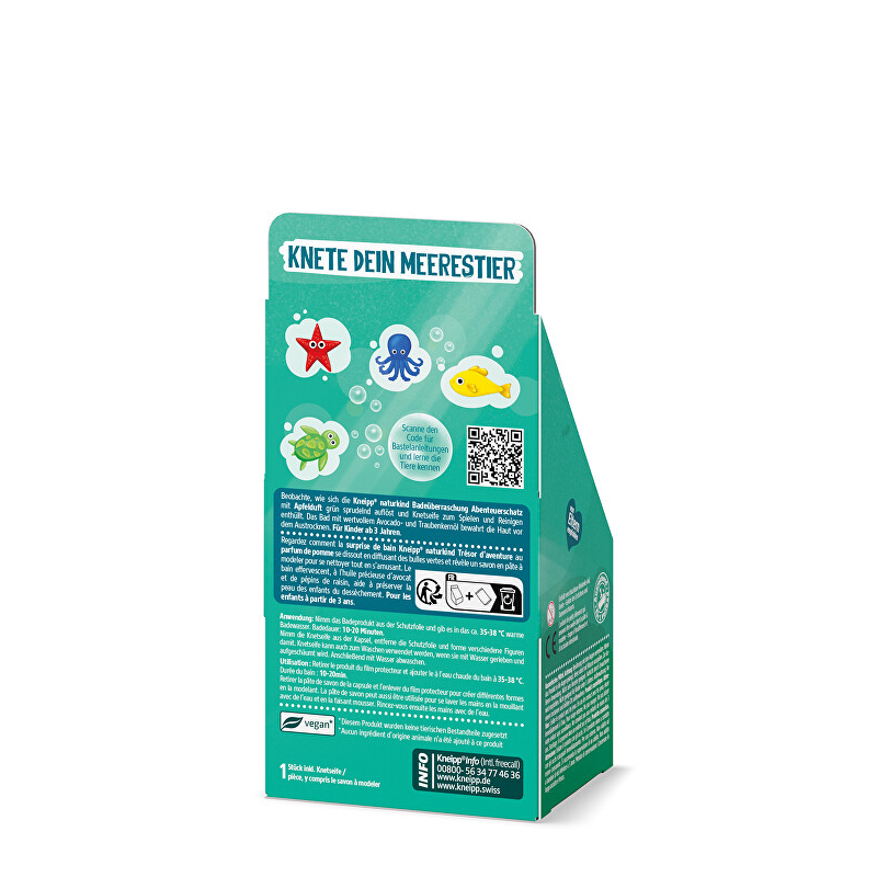 Koupelová bomba Kneipp Tajemný poklad přináší do každé vany dobrodružství plné zábavy. Tvar pirátské truhly se po vhození do teplé vody promění v šumivou podívanou, která barví vodu na zeleno a naplňuje koupel osvěžující jablečnou vůní. Uvnitř truhly čeká překvapení – kapsle s modelovacím mýdlem v jedné ze čtyř barev. Děti si mohou vytvořit vlastní mořská zvířátka, která pak slouží jako běžné mýdlo. Složení je veganské a neobsahuje žádné živočišné produkty, mikroplasty ani konzervanty. Olej z hroznových jader a avokádový olej pečují o citlivou pokožku, což z této koupele činí nejen zábavu, ale i péči.