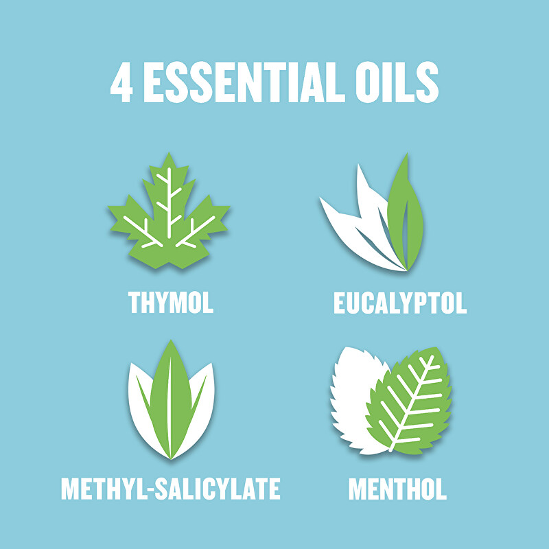 Aqua, Propylene Glycol, Sorbitol, Poloxamer 407, Sodium Lauryl Sulfate, Eucalyptol, Benzoic Acid, Sodium Benzoate, Methyl Salicylate, Thymol, Sodium Saccharin, Sodium Fluoride, Menthol, Sucralose, Aroma, CI 42053. Obsahuje fluorid sodný (220 ppm F-).