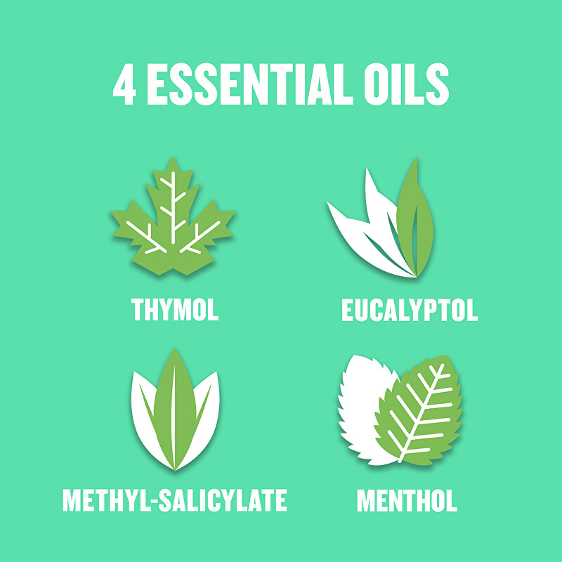 Aqua, Sorbitol, Propylene Glycol, Sodium Lauryl Sulfate, Poloxamer 407, Benzoic Acid, Eucalyptol, Methyl Salicylate, Thymol, Sodium Saccharin, Sodium Fluoride, Sodium Benzoate, Menthol, Aroma, Benzyl Alcohol, Sucralose, CI 47005, CI 42053. Obsahuje fluorid sodný (220 ppm F-)