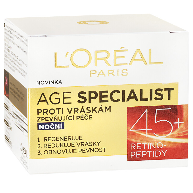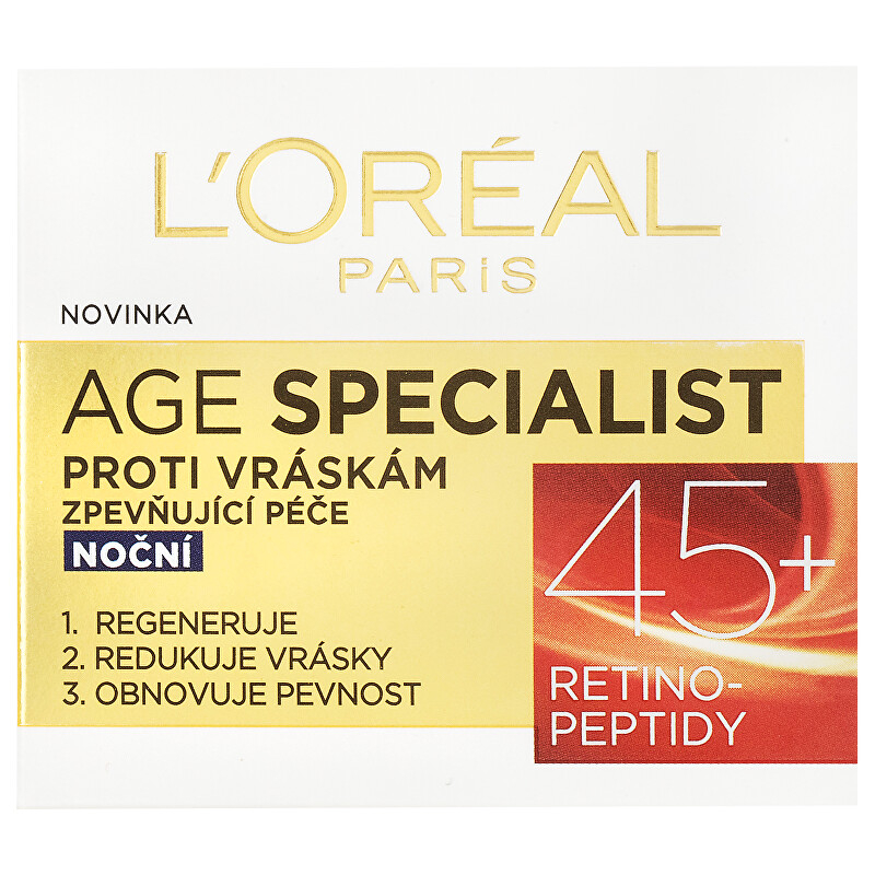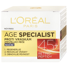 Noční krém proti vráskám Age Specialist 45+ je ideálním společníkem pro zralou pleť, která potřebuje obnovit svou pevnost a mladistvý vzhled. Obsahuje unikátní retino-peptidy, které aktivně redukují jemné linky a vrásky, čímž zajišťují liftingový efekt. Tento krém nejenže vyhlazuje pleť, ale také ji vyživuje a regeneruje během spánku, kdy je pleť nejvíce receptivní. Pravidelným používáním každou noc dosáhnete viditelného zpevnění pleti a zdravějšího vzhledu. Dopřejte své pleti to nejlepší a užijte si pocit svěžesti a vitality každé ráno.