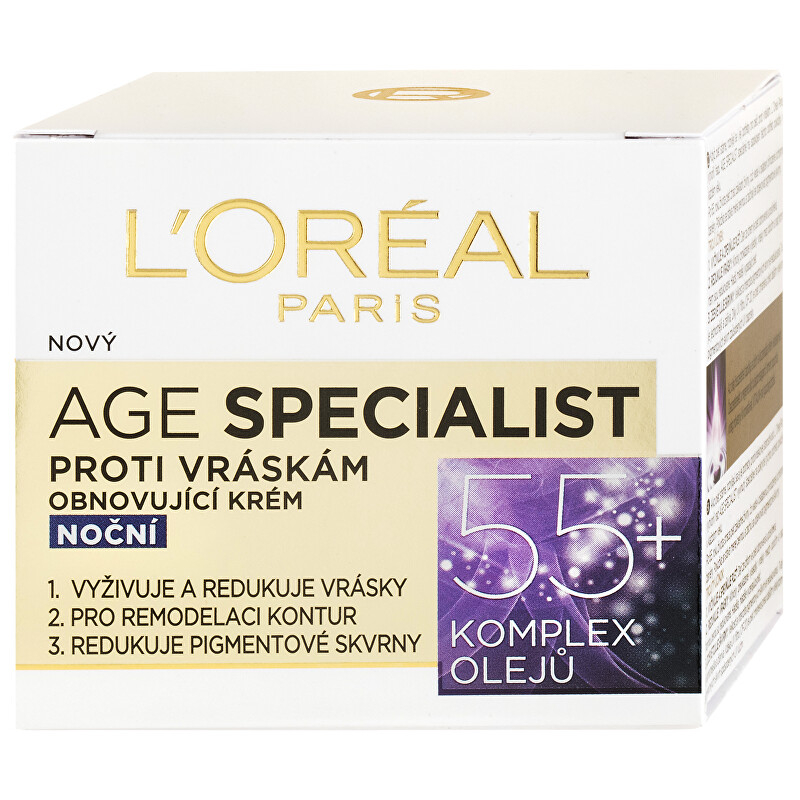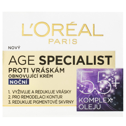 Noční krém proti vráskám Age Specialist 55+ je navržen tak, aby poskytoval intenzivní regeneraci pleti během spánku. Obsahuje unikátní olejový komplex, který proniká do hlubších vrstev pleti a pomáhá redukovat i ty nejhlubší vrásky. Díky svému liftingovému efektu obnovuje pevnost a pružnost pleti, čímž dodává obličeji mladistvý vzhled. Pravidelným používáním každý večer na čistou pleť se zlepší textury pleti a vyhladí jemné linky. Tento krém je ideální volbou pro ženy nad 55 let, které touží po efektivní a cílené péči o pleť. Vsaďte na kvalitu a přirozenou krásu s Age Specialist.