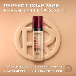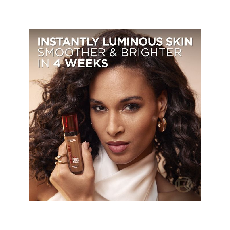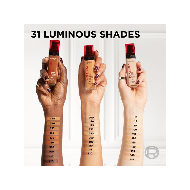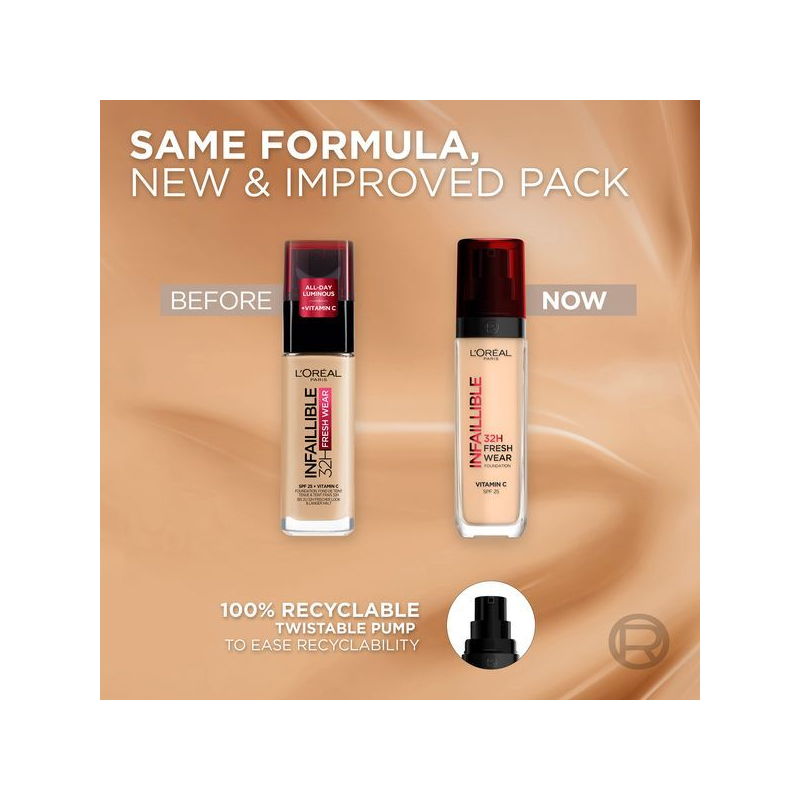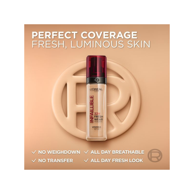 make-up Infaillible 32H Fresh Wear SPF 25 od L'Oréal Paris přináší revoluci v líčení. Díky inovovanému složení a extrémně držícím pigmentům zajišťuje perfektní krytí po celý den, aniž by vytvářel efekt masky. Kyselina hyaluronová se postará o celodenní hydrataci a svěží vzhled, což oceníte zejména při aktivním životním stylu. Tento make-up je odolný vůči doteku, vlhkosti i sportovním aktivitám, takže se můžete spolehnout na jeho dlouhotrvající efekt. S Infaillible 32H Fresh Wear se budete cítit sebevědomě a přirozeně po celý den. Stačí rovnoměrně rozetřít a užít si bezstarostné líčení.
