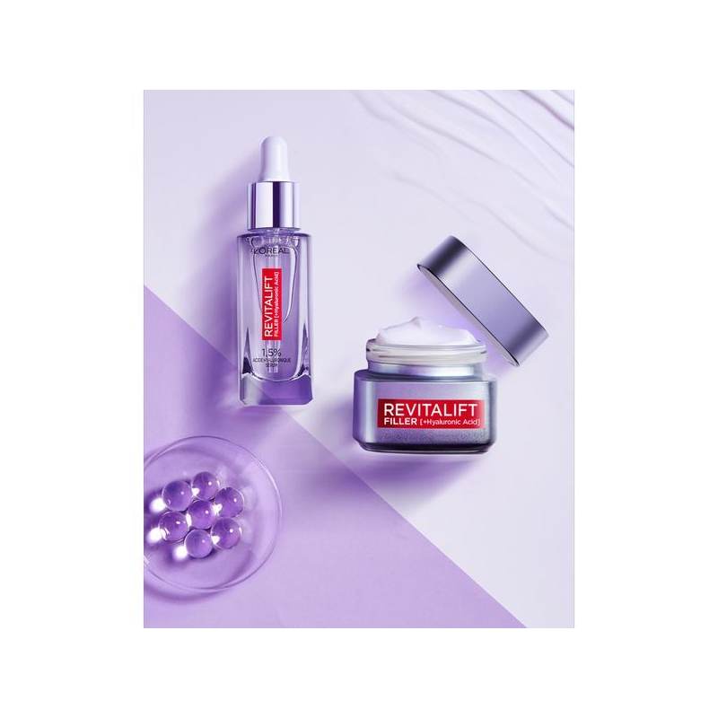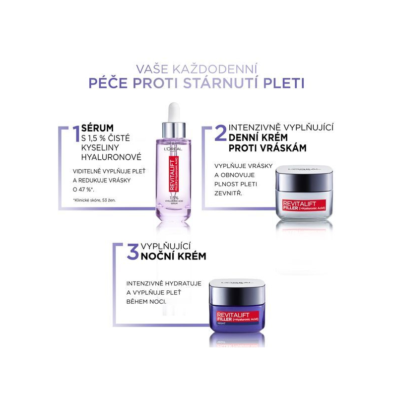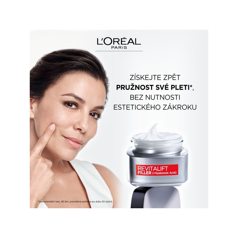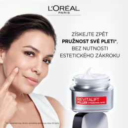 Revitalift Filler [HA] je denní krém, který přináší revoluční přístup k péči o pleť. Díky nejvyšší koncentraci kyseliny hyaluronové obnovuje hutnost pleti a účinně vyplňuje vrásky. Obsahuje také rostlinný výtažek Fibroxyl, který postupně navrací pleti plnost a omlazuje rysy obličeje. Po pouhých čtyřech hodinách se pleť stává pevnější a hydratovanější, zatímco po čtyřech týdnech se prokazatelně zmenšují vrásky na čele a kolem očí. Tento krém je ideální pro ženy ve věku 50–60 let, které touží po mladistvém vzhledu a zdravé pleti. Nanášejte každé ráno na čistou pleť a užijte si viditelné výsledky.