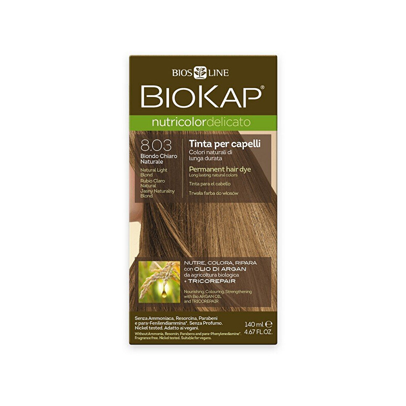 Nutricolor Delicato - Barva na vlasy 8.03 Blond přírodní světlá je ideální volbou pro ty, kteří hledají kvalitní a šetrné barvení. Tento permanentní produkt je z 92 % přírodní a neobsahuje amoniak, parabeny ani resorcin. Díky pečujícím přírodním extraktům dodává vlasům dlouhotrvající zářivou barvu a lesk, zatímco zároveň chrání pokožku hlavy. Barva dokonale kryje šediny a je testována na obsah niklu, což zajišťuje bezpečnost použití. Součástí balení je také kondicionér pro výživu a ochranu vlasů po barvení. Dopřejte svým vlasům péči, kterou si zaslouží.