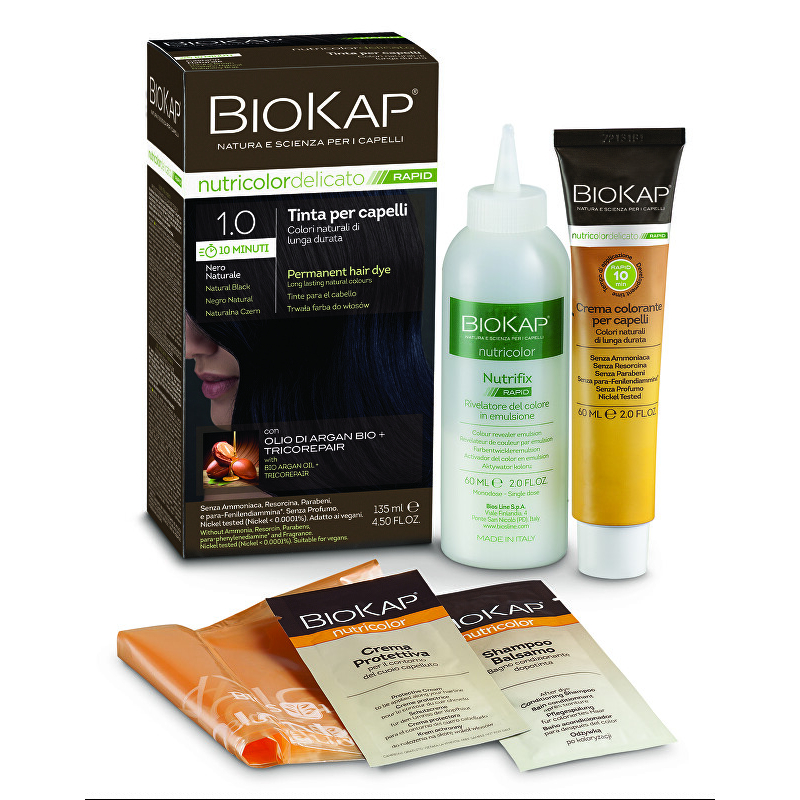 Objevte šetrnou a rychlou BIOKAP DELICATO RAPID barvu na vlasy v odstínu 1.0 Přírodní černá. Tato přírodní barva zajišťuje dokonalé překrytí šedin a vytváří jasnou, lesklou barvu s zdravým vzhledem. Díky inovativnímu TRICOREPAIR komplexu, který obsahuje rýžové proteiny, výtažek z vrby a lipofilní ovocné kyseliny, chrání vlasy a podporuje jejich regeneraci. Balení obsahuje vše potřebné pro snadnou aplikaci, včetně ochranných rukavic a balzámu po barvení. Vhodná pro vegany a šetrná k životnímu prostředí, tato barva je ideální volbou pro každou ženu, která hledá kvalitní a přírodní způsob barvení vlasů.