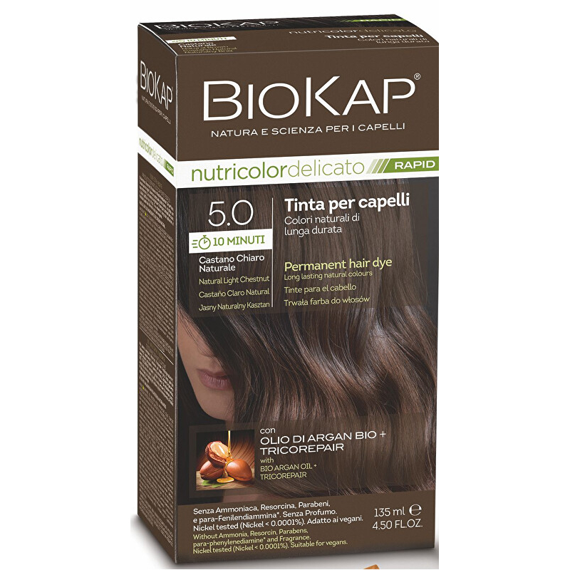 BIOKAP DELICATO RAPID barva na vlasy - 5.0 Kaštanová světlá přírodní je ideálním řešením pro ty, kteří hledají šetrné a rychlé barvení. Tato přírodní barva zajišťuje intenzivní jasnost, lesk a zdravý vzhled vlasů, přičemž efektivně překrývá šediny. Díky inovativnímu TRICOREPAIR komplexu, který obsahuje rýžové proteiny, výtažek z vrby a ovocné kyseliny, chrání vlasy a podporuje jejich regeneraci. Balení obsahuje vše potřebné pro snadnou aplikaci, včetně ochranných rukavic a balzámu po barvení. Vhodná pro vegany a ekologicky šetrná, tato barva je skvělou volbou pro každou ženu, která chce pečovat o své vlasy.