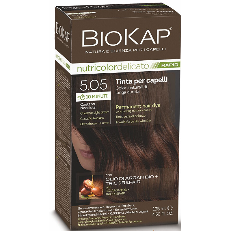 Objevte šetrnou a rychlou BIOKAP DELICATO RAPID barvu na vlasy v odstínu 5.05 Kaštanově oříšková. Tato přírodní barva zaručuje dokonalou jasnost, lesk a zdravý vzhled vašich vlasů, přičemž efektivně překrývá šediny. Díky inovativnímu TRICOREPAIR komplexu, který obsahuje rýžové proteiny a výtažky z vrby, poskytuje ochranu a regeneraci vlasů během barvení. Balení obsahuje vše potřebné pro snadnou aplikaci, včetně ochranných rukavic a balzámu po barvení. Vytvořte si krásné vlasy bez kompromisů na zdraví a kvalitě.