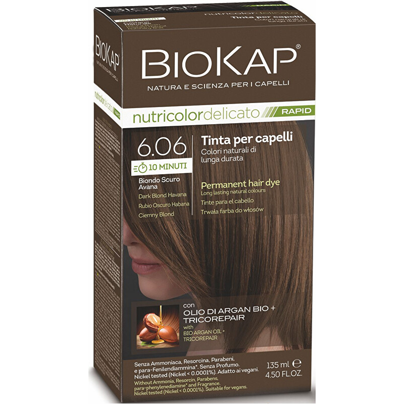 Objevte šetrnou a extra rychlou BIOKAP DELICATO RAPID barvu na vlasy v odstínu 6.06 Tmavá blond Havana. Tato přírodní barva zaručuje dokonalé krytí šedin a přináší jasnou barvu s leskem a zdravým vzhledem vlasů. Inovativní TRICOREPAIR komplex, obsahující rýžové proteiny, výtažek z vrby a lipofilní ovocné kyseliny, poskytuje ochranu a regeneraci vlasů během barvení. Balení obsahuje vše potřebné pro snadnou aplikaci, včetně ochranných rukavic a balzámu po barvení. Vytvořte si krásný vzhled s přírodními ingrediencemi, které pečují o vaše vlasy.