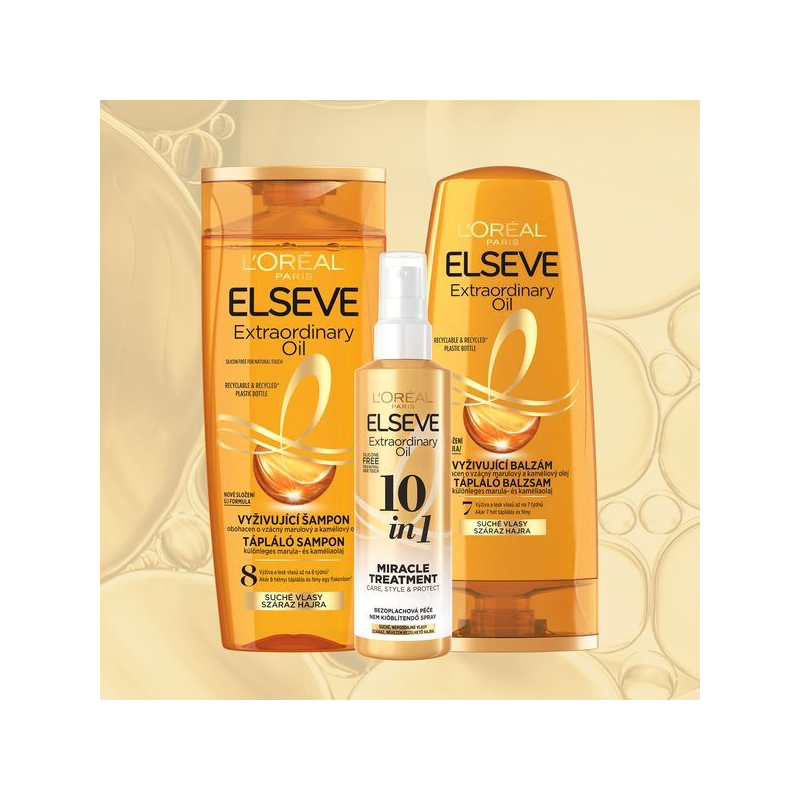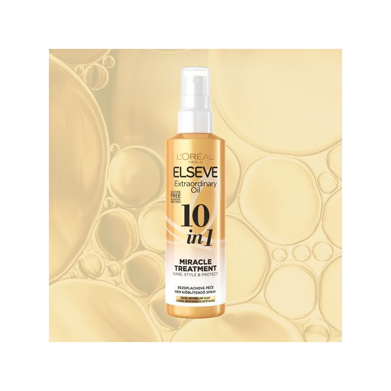 Bezoplachová péče Elseve 10 in 1 Extraordinary Oil přináší revoluční způsob, jak dosáhnout zdravých a krásných vlasů. Toto unikátní ošetření, obohacené o vzácné oleje, poskytuje komplexní péči, styling a ochranu v jednom kroku. Díky svému složení bez silikonů zanechává vlasy přirozené na dotek, zatímco je vyživuje až 10krát více a snižuje lámavost o 99 %. Lesk vlasů se zvýší o 18 %, což dodává účesu oslnivý vzhled. Snadné rozčesávání a tepelná ochrana do 230 °C chrání vlasy před každodenními vlivy. Redukce krepatění až na 24 hodin zajišťuje, že vlasy zůstanou pod kontrolou po celý den. Stačí nastříkat na suché nebo vlhké vlasy a upravit podle potřeby.