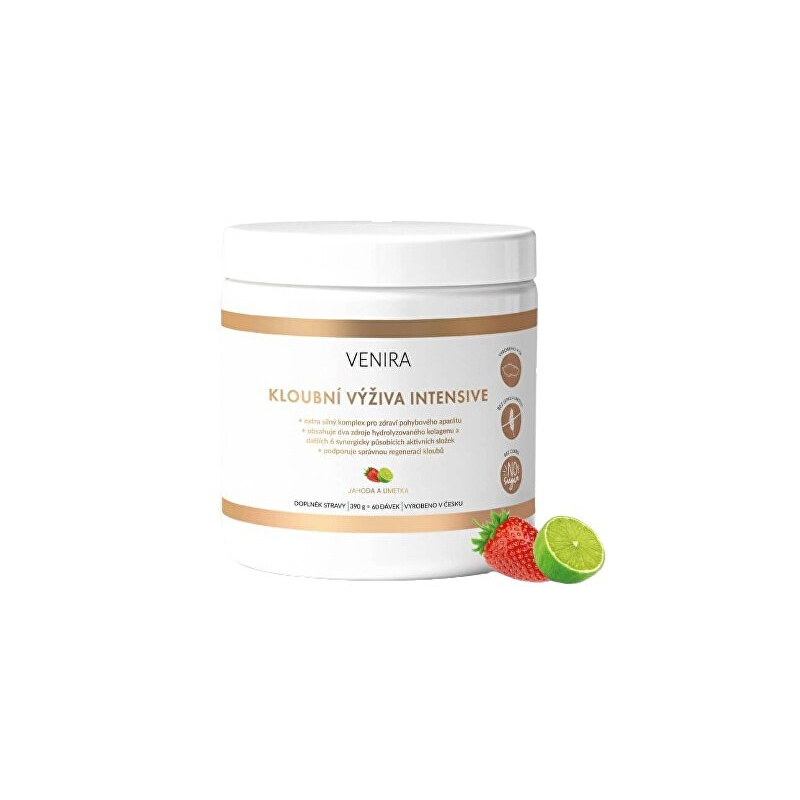 Kloubní výživa intensive jahoda-limetka od značky Venira je lahodný nápoj, který přináší komplexní podporu pro vaše klouby, kosti, vazy a šlachy. Obsahuje glukosamin sulfát 2KCl v denní dávce 1600 mg, který přispívá k normální funkci kloubů a zlepšuje jejich hybnost. Dva zdroje hydrolyzovaného kolagenu, vepřový a rybí, dodávají tělu potřebné stavební bloky pro regeneraci chrupavky. Doplňují je MSM a chondroitin sulfát, které podporují zdraví pojivových tkání. S přídavkem kadidlovníku a harpagofytu pro zlepšení pohyblivosti je tento produkt ideální volbou pro aktivní jedince. Neobsahuje lepek ani laktózu.