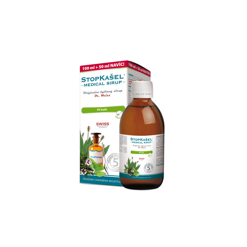 STOPKAŠEL® Medical sirup Dr. Weiss je zdravotnický prostředek, který kombinuje účinné extrakty z pěti bylin: jitrocele, boswellie, mateřídoušky, bazalky a eukalyptu. Tento sirup zklidňuje podrážděný krk a přináší úlevu při škrábání v krku. Je vhodný pro celiaky a diabetiky, neboť je slazen fruktózou a sukralózou. Těhotné a kojící ženy mohou sirup užívat bez obav, protože obsahuje pouze šetrné byliny. Doporučené dávkování je 1 polévková lžíce pro dospělé a 1 čajová lžička pro děti. Před použitím je dobré sirup protřepat. Balení obsahuje 300 ml.