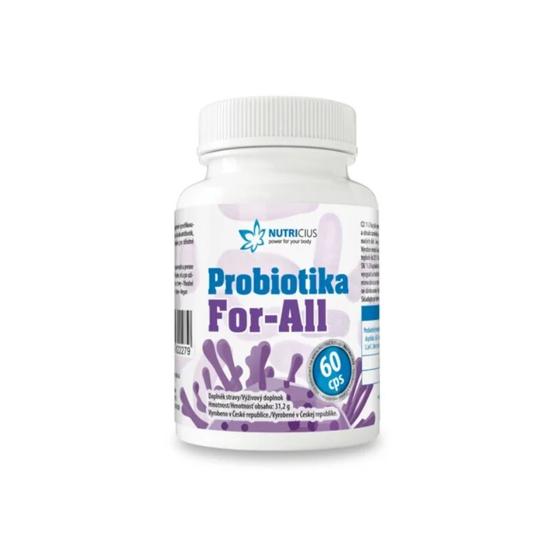 Nutricius probiotika For-All je vysoce kvalitní doplněk stravy, který obsahuje devět různých kmenů probiotik s celkovým obsahem 40 miliard CFU v denní dávce. Tento produkt je ideální pro podporu zdravé střevní mikroflóry, zejména po užívání antibiotik. Složení je obohaceno o vitamin C, který přispívá k normální funkci imunitního systému a pomáhá snižovat únavu. probiotika jsou rostlinného původu, což je činí vhodnými pro vegany a vegetariány. Užívejte 1-2 kapsle denně a objevte přínosy pro své zdraví. Balení obsahuje 60 kapslí.