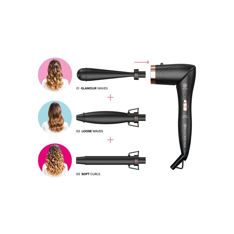 Kulma na vlasy Bellissima 11888 My Pro Twist & Style nabízí jedinečnou možnost přizpůsobení vašemu stylu. Díky třem různým nástavcům – Glamour Waves, Loose Waves a Soft Curls – snadno vytvoříte vlny podle aktuální nálady. Ergonomická rukojeť a možnost natočení o 90° zajišťují pohodlné používání, zatímco keramický povrch chrání vlasy před poškozením. Samoregulace teploty a LED kontrolka vám umožní mít vždy kontrolu nad stylingem. S otočným kabelem o délce 1,8 m se snadno dostanete ke každému pramenu. Vytvořte si dokonalý účes s lehkostí a elegancí.