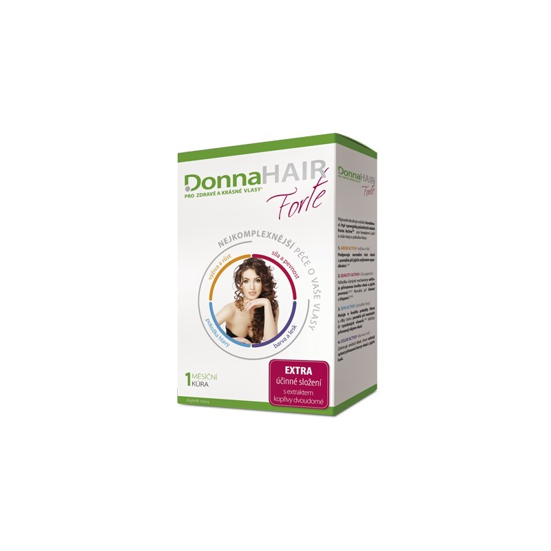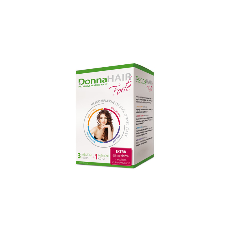 Doplněk stravy DonnaHair Forte je navržen pro podporu zdravého růstu vlasů a zlepšení jejich kvality. Obsahuje unikátní kombinaci aminokyselin, biotinu a extraktu z kopřivy, které společně pomáhají při nadměrném vypadávání, lámání a třepení vlasů. Přípravek je speciálně přizpůsoben pro potřeby těhotných a kojících žen. Díky čtyřem synergicky působícím složkám Forte Active získáte komplexní péči o vlasy a pokožku hlavy. Užívejte jednu tobolku denně pro dlouhodobé výsledky a vychutnejte si zdravější, silnější a lesklejší vlasy. Ideální volba pro ženy, které chtějí zlepšit vzhled svých vlasů.