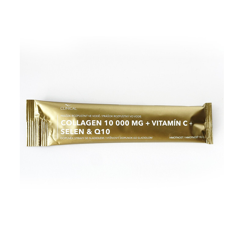 Collagen 10000 mg + vitamín C + selen + Q10 je vysoce kvalitní doplněk stravy, který podporuje zdraví pleti, vlasů a nehtů. Obsahuje 10 000 mg hydrolyzovaného kolagenu typu I, který zajišťuje pevnost a pružnost pojivových tkání. Vitamín C přispívá k normální tvorbě kolagenu a podporuje imunitní systém. Koenzym Q10 dodává buňkám energii a selen pomáhá udržovat zdravý stav nehtů a vlasů. Tento produkt je ideální pro každého, kdo chce podpořit svou krásu a vitalitu. Užívejte jeden sáček denně pro optimální výsledky. Balení obsahuje 30 sáčků s příjemnou ananasovou příchutí.