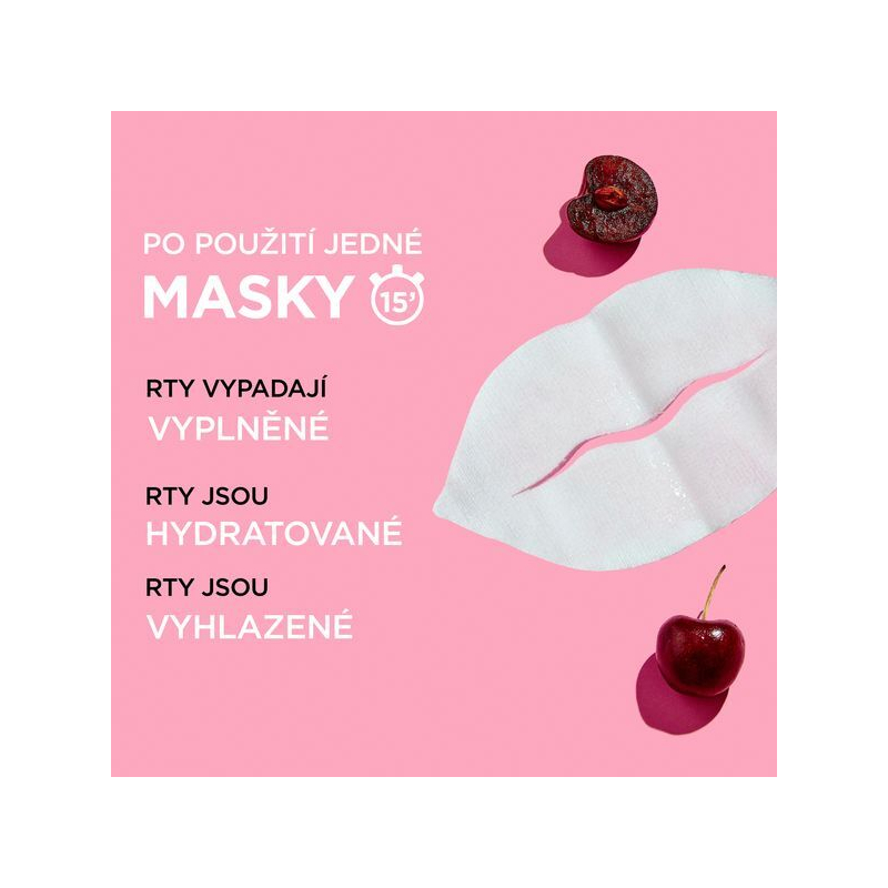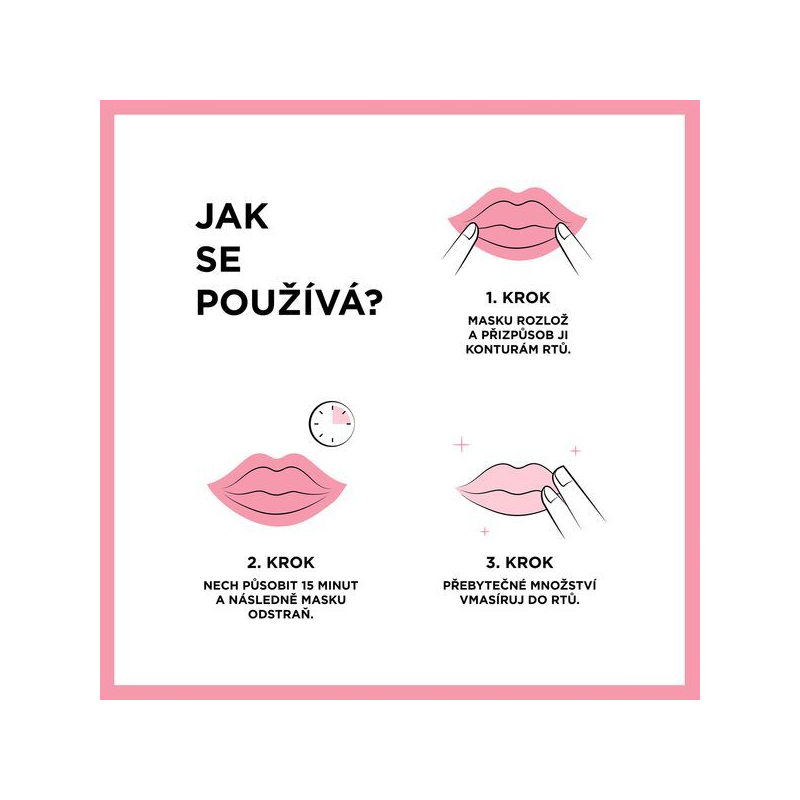 Naneste na čisté a suché rty a nechte působit 15 minut. Po uplynutí potřebné doby masku odstraňte a přebytečné sérum vmasírujte do rtů.