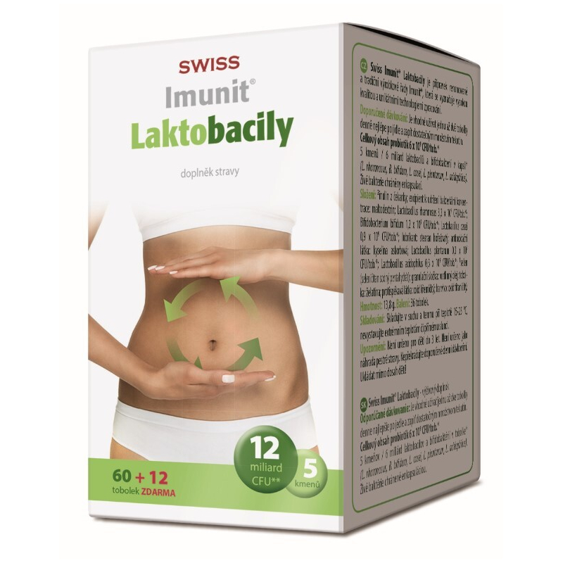 Laktobacily Swiss Imunit jsou vysoce kvalitním doplňkem stravy ve formě tobolek, které obsahují kombinaci 5 kmenů laktobacilů a bifidobakterií, přičemž denní dávka (2 tobolky) poskytuje 12 miliard aktivních probiotických organismů. Tento produkt je obohacen o selen, který podporuje normální funkci imunitního systému, a prebiotickou vlákninu inulin z čekanky, která napomáhá zdravému trávení. Užívejte 1-2 tobolky denně po jídle a dopřejte svému tělu potřebnou podporu pro optimální trávení a imunitu. Doplněk stravy není určen pro děti do 3 let a neměl by nahrazovat pestrou stravu.