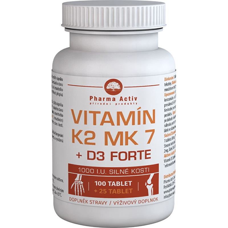 Doplněk stravy Vitamín K2 MK7 + D3 Forte 1000 I.U. od značky Pharma Activ je ideálním spojencem pro udržení zdraví vašich kostí a zubů. Obsahuje vitamín K2, který přispívá k normální srážlivosti krve a zdravému stavu kostí, a vitamín D3, jenž podporuje vstřebávání vápníku a fosforu. Tento produkt také napomáhá správné funkci svalů a imunitního systému. Každá tableta obsahuje 100 mcg vitamínu K2 a 25 mcg vitamínu D3, což představuje významný příspěvek k vašemu zdraví. Užívejte jednu tabletu denně s jídlem a dopřejte svému tělu potřebné živiny pro optimální fungování.